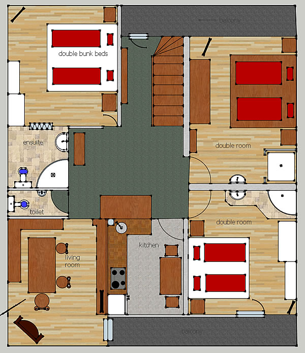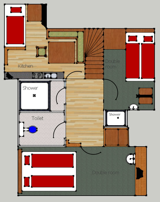 Das dritte Zimmer eignet sich besonders für Familien mit Kindern. Es ist mit 2 Doppelstockbetten und einem eigenen Badezimmer (Dusche, Waschbecken und WC) ausgestattet.